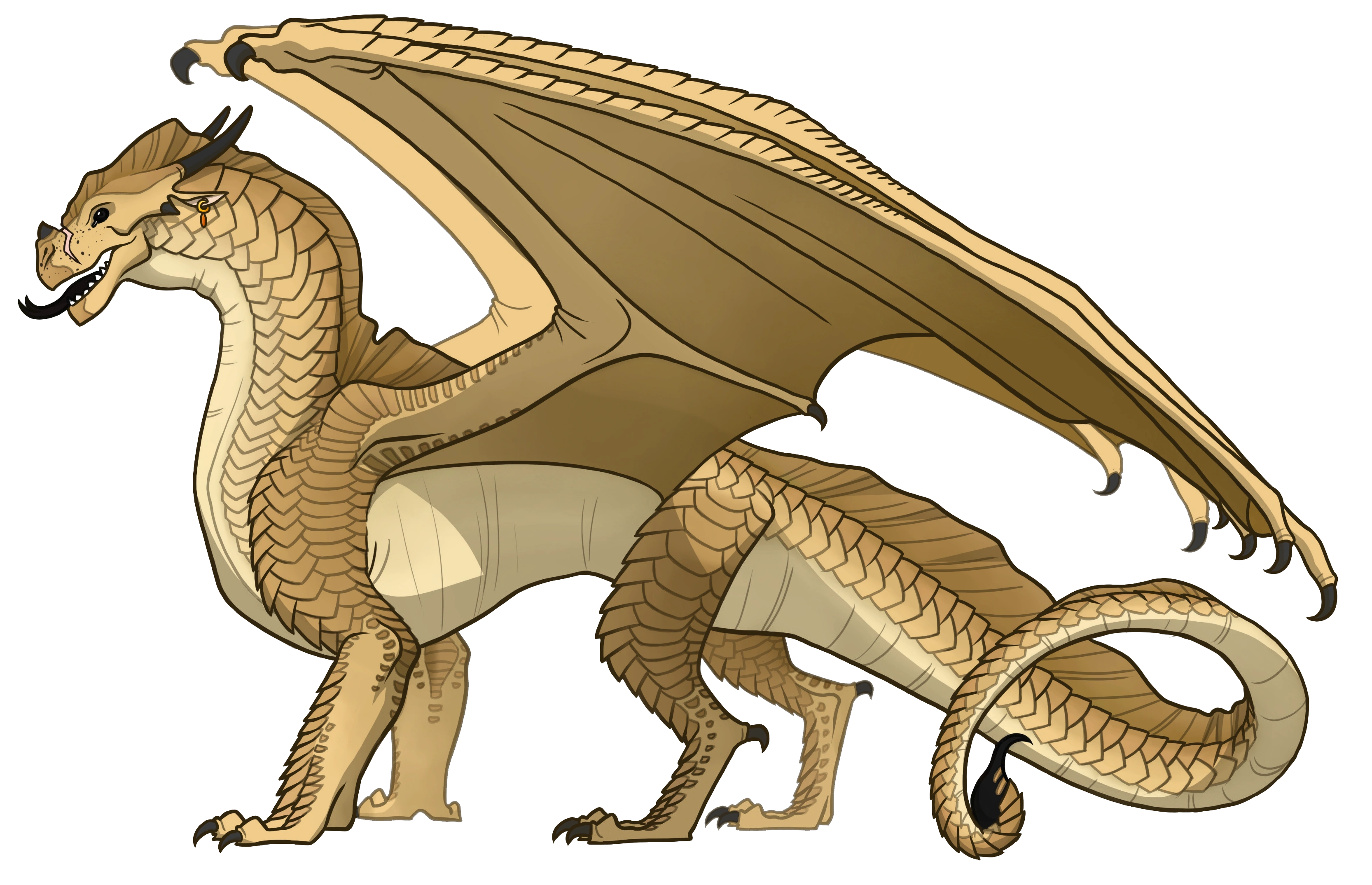 Qibli is wiry and narrow-shouldered,[1] with pale,[2] light,[3] sandy-yellow scales[4] and yellow wings.[5] His snout is speckled with a few tiny[6] dark brown freckles[7] and has a small, rakish scar zigzagging across it.[8] He wears a small, shiny, warm,[9] gold hoop earring in his left ear that is hung with a warm, orange-amber teardrop.[7] He is scruffy,[10] scrawny,[11] and slightly larger than Kinkajou.[1] He has sharp[12] obsidian-black eyes.[13]