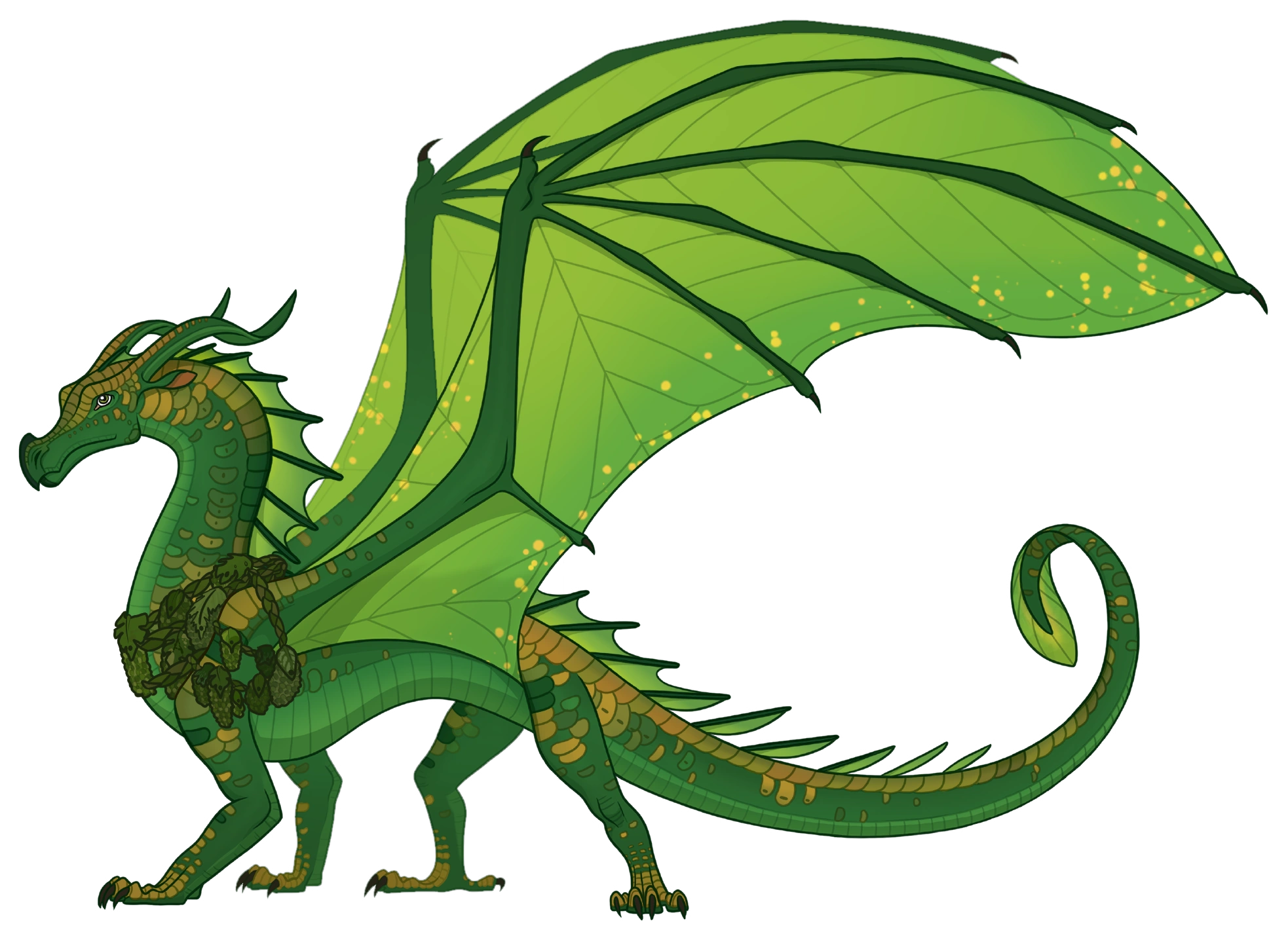 Sundew has a small[1] and wiry[2] shape and a face that is similar to Belladonna's.[3] She has dark[2] forest-green[4] scales that are flecked with gold,[5] and she also has golden scales along the edges of her wings, talons, and across her snout.[6] She wears several small pouches, woven from long grass or fashioned from leaves,[3] which contain venomous insects or useful plants. A pouch that rests over her heart contains a small,[7] smooth jade frog,[8] and there is a pouch under her left wing that is a darker shade of green than the others.[9] There is also a pouch marked with a large A, and it holds a jar for bullet ants inside.[10] She is slightly smaller than Swordtail,[11] and smaller than Tsunami.[12]
